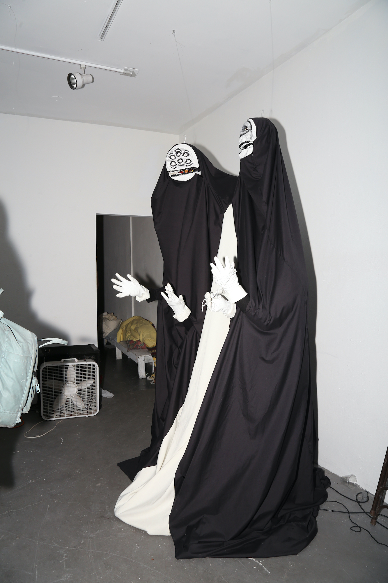 Nevil and Ellis is a light-reactive noise puppet created and performed by five collective members. Each face has a light-reactive sensor in its mouth and lights in its eye. The two figures converse, their speech broadcasted by two amplifiers inside their cloak. Created for Mouthpiece, a show of noise puppets conceived of and curated by Marisa Demarco in August 2016.